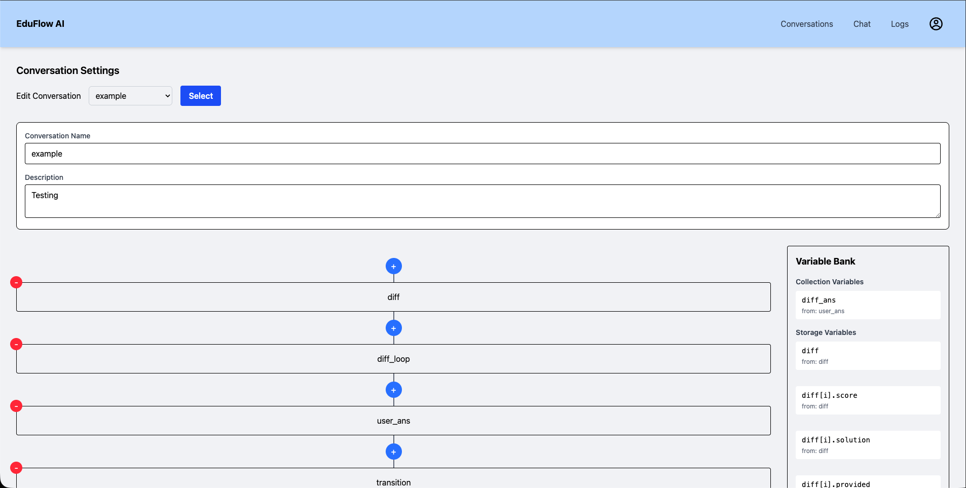 A powerful framework for educators to build agentic AI conversations using node-based flows that can collect data, compare responses, loop through content, and guide students through personalized learning experiences. React and TypeScript course assistant platform with Python backend enabling instructors to create interactive chatbots for self-paced learning. Integrated MariaDB with vector search and OpenAI models for semantic retrieval and adaptive reasoning. Supports third-party API plugins to pull live course data into EECS chatbots.